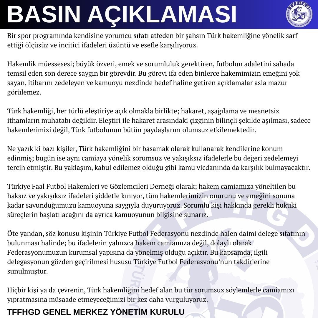 Türkiye Faal Futbol Hakemleri ve Gözlemcileri Derneği olarak; hakem camiamıza yöneltilen bu haksız ve yakışıksız ifadeleri şiddetle kınıyor, tüm hakemlerimizin onurunu ve emeğini sonuna kadar savunduğumuzu kamuoyuna saygıyla duyuruyoruz. Sorumlu kişi hakkında gerekli hukuki süreçlerin başlatılacağını da ayrıca kamuoyunun bilgisine sunarız.